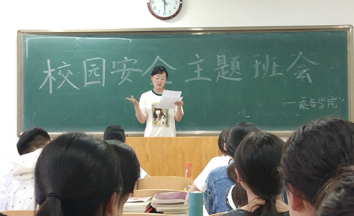 张老师从8个方面简要介绍了本次校园安全主题班会内容;1.要遵守国家法律法规、遵守校规校纪 2.宗教信仰与意识形态安全 3交通与出行 4.宿舍消防和住宿安全 5.网络法制安全 6.关于女生安全 7.实验室安全 8.生命安全、远离黄赌毒;最后,通过具体的事例向学生们讲述了校园周边存在的一些安全隐患和校园安全常识,为学生们敲醒了安全的警钟!