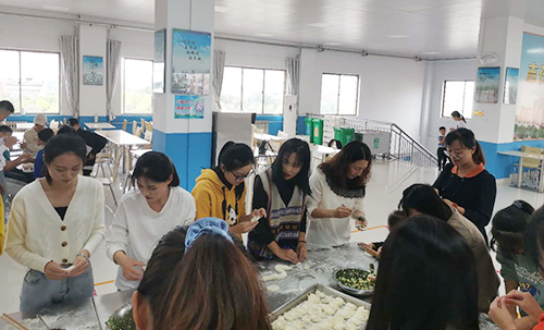 上午10点,党总支书张凤英、全体辅导员以及班主任来到乘务学员餐厅和留校学生一起庆国庆、过中秋。餐厅事先已经准备好面团、饺子馅、擀面杖等必备材料和工具,师生们围在桌子面前共同包水饺,老师们擀面、包水饺的动作很娴熟,同学们也不甘落后,他们相互协作、互帮互助,大家在11点左右包完了水饺。除此之外,餐厅还为师生们精心准备了很多月饼、水果以及很多美味菜肴。中午11点40分,师生们围聚在一起,共同为祖国庆生,欢庆中秋佳节。