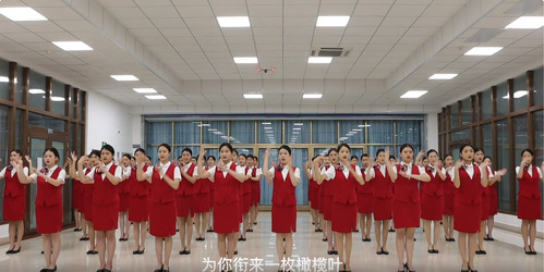 “今天是你的生日,我的中国,清晨我放飞一群白鸽……”乘务学子身着制服,怀着激动的心情唱响《今天是你的生日》。学生们青春洋溢的微笑与整齐的手势舞,用真挚的情感为祖国母亲庆生。