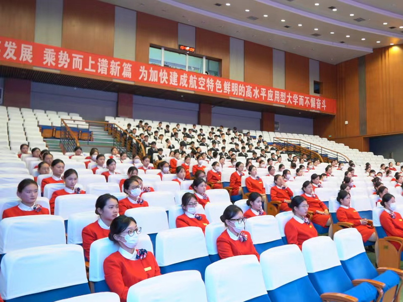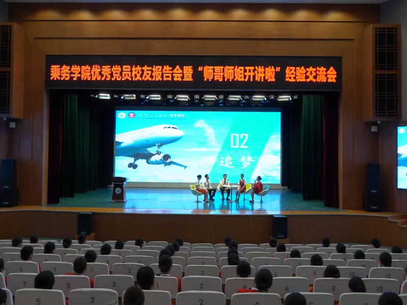 本期活动邀请春秋航空公司乘务长、2017级校友吕桂浩,山东航空公司乘务员、2020级校友赵欣慧,深圳航空公司乘务员、2020级校友于璇,日照莒县公安局干警、2020级校友王铭扬四位校友返校交流。他们根据亲身经历,围绕“追忆”“追梦”“追光”讲述了自己从校园到职场、从学生到职员的成长轨迹。吕桂浩和赵欣慧结合自身的成长经历和飞行时遇到的案例,强调了职业素养养成、专业技能和英语学习对职业发展的重要性,并分享了如何快速成长为一名合格客舱乘务员的宝贵经验。于璇分享了参加乘务员社会招聘和职场面试的心得体会,勉励在校同学要专注当下,珍惜学习时光,努力提高自身的知识储备和专业素养。王铭扬结合考取公务员的经历,从自律意识、岗位选择、时间规划、复习策略等方面展开讲解,鼓励同学们要严格遵守校规校纪,养成良好生活习惯,科学谋划就业岗位。